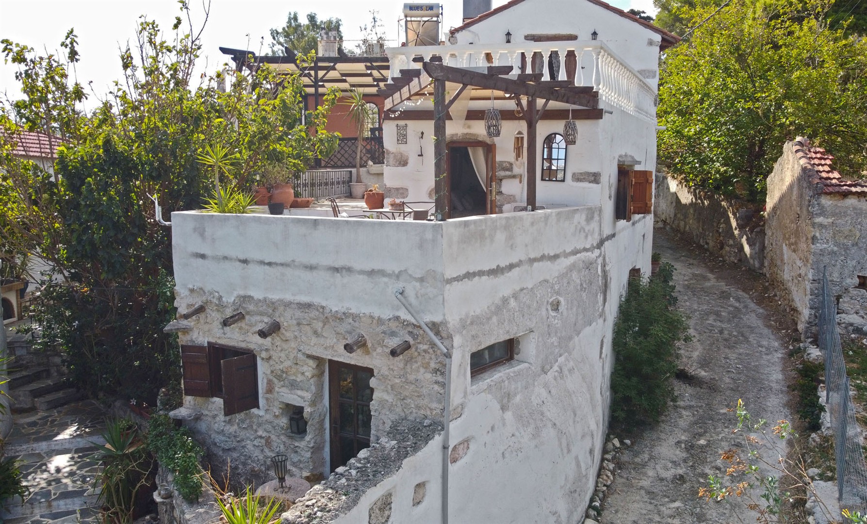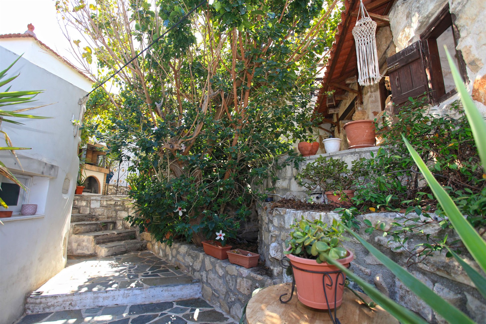 Steps lead from the main courtyard to the second self-contained studio. Again, this has its own courtyard, terraces, cozy seating areas and a BBQ. It is very private - with its own gate and an entrance from the village lane. There is ample parking in the square close to the property and an access road to the entrance of the main house.