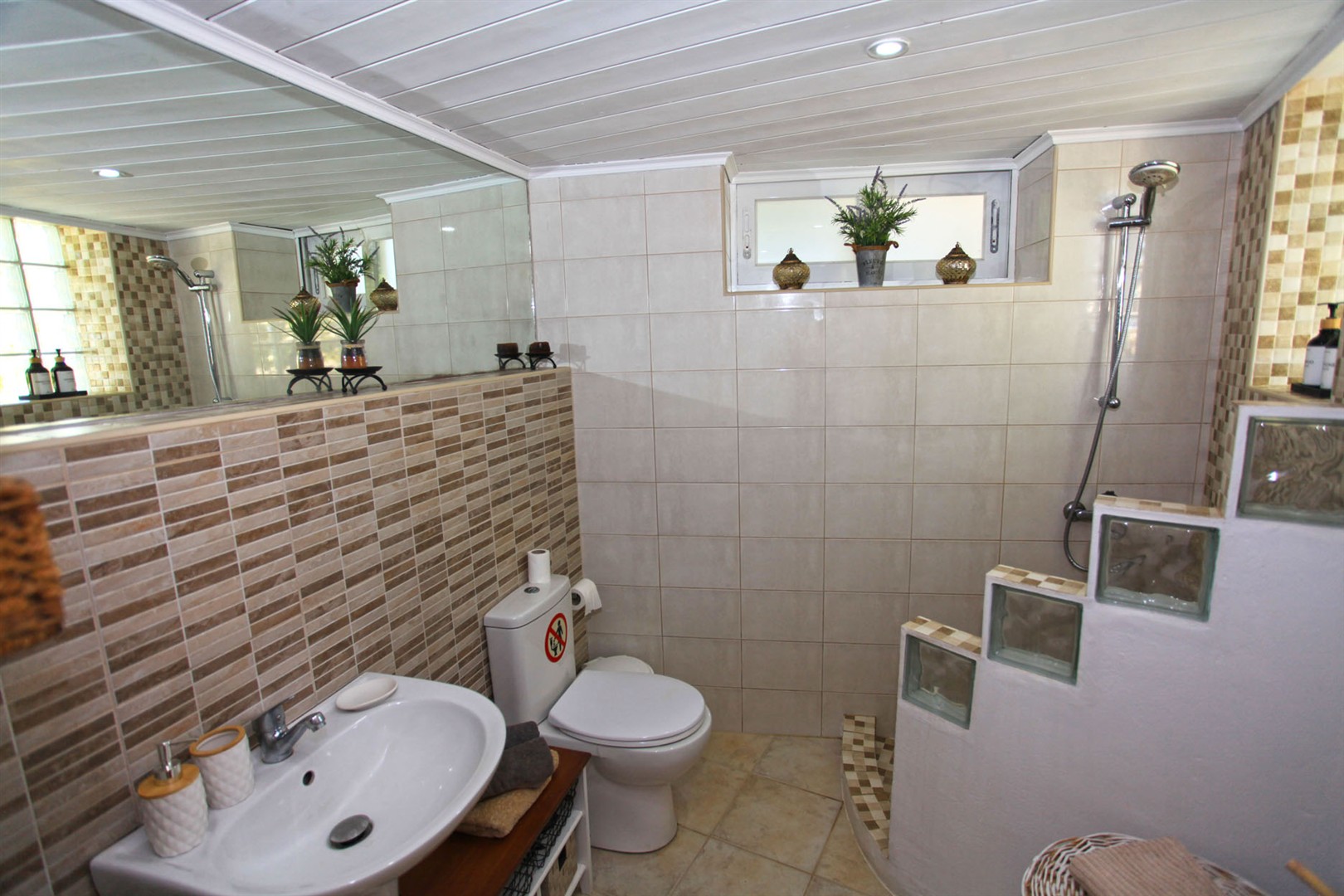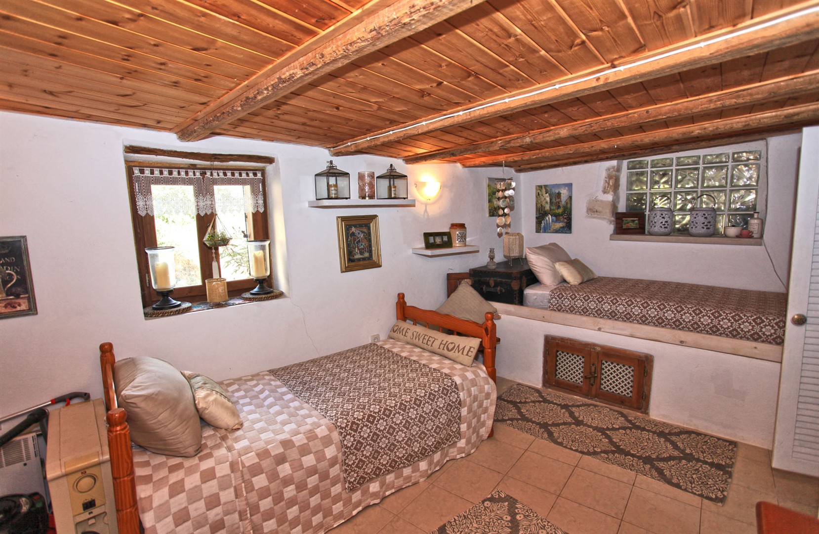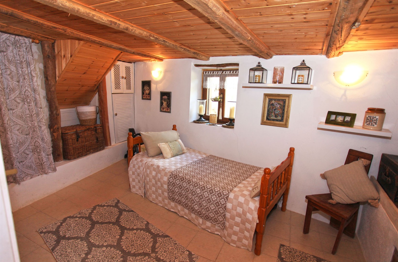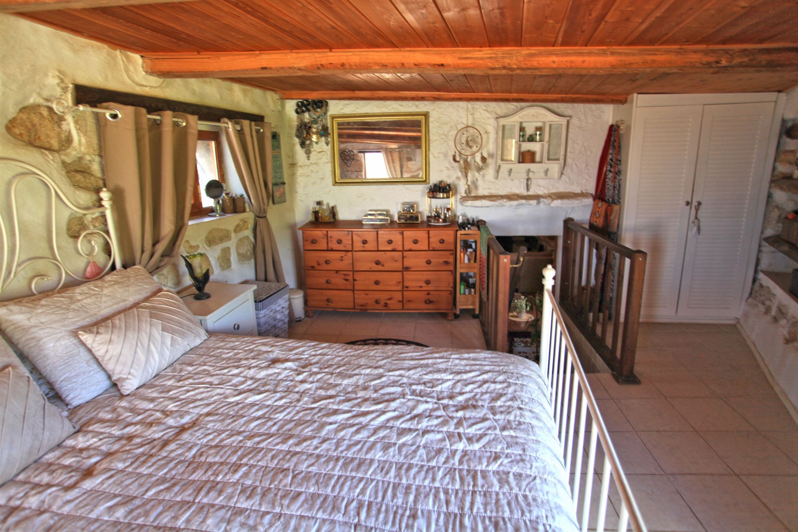 Steps lead from here up to the master bedroom - with lovely wooden ceilings and its own private part covered terrace area.