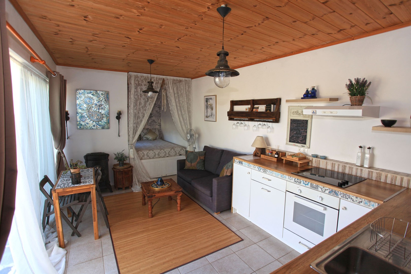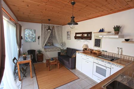 The studio has a spacious open plan fitted kitchen with appliances, living area and sleeping area - with vast white vaulted ceilings and a fireplace. It also has a living area with wood burning stove, a good sized fitted kitchen with appliances, a double bedroom in a pretty alcove and a shower room with an attractive mosaic-tiled shower. There is additional storage here also.