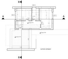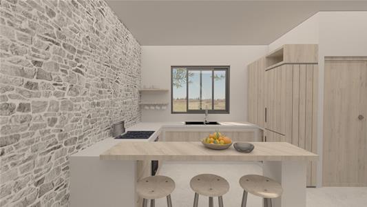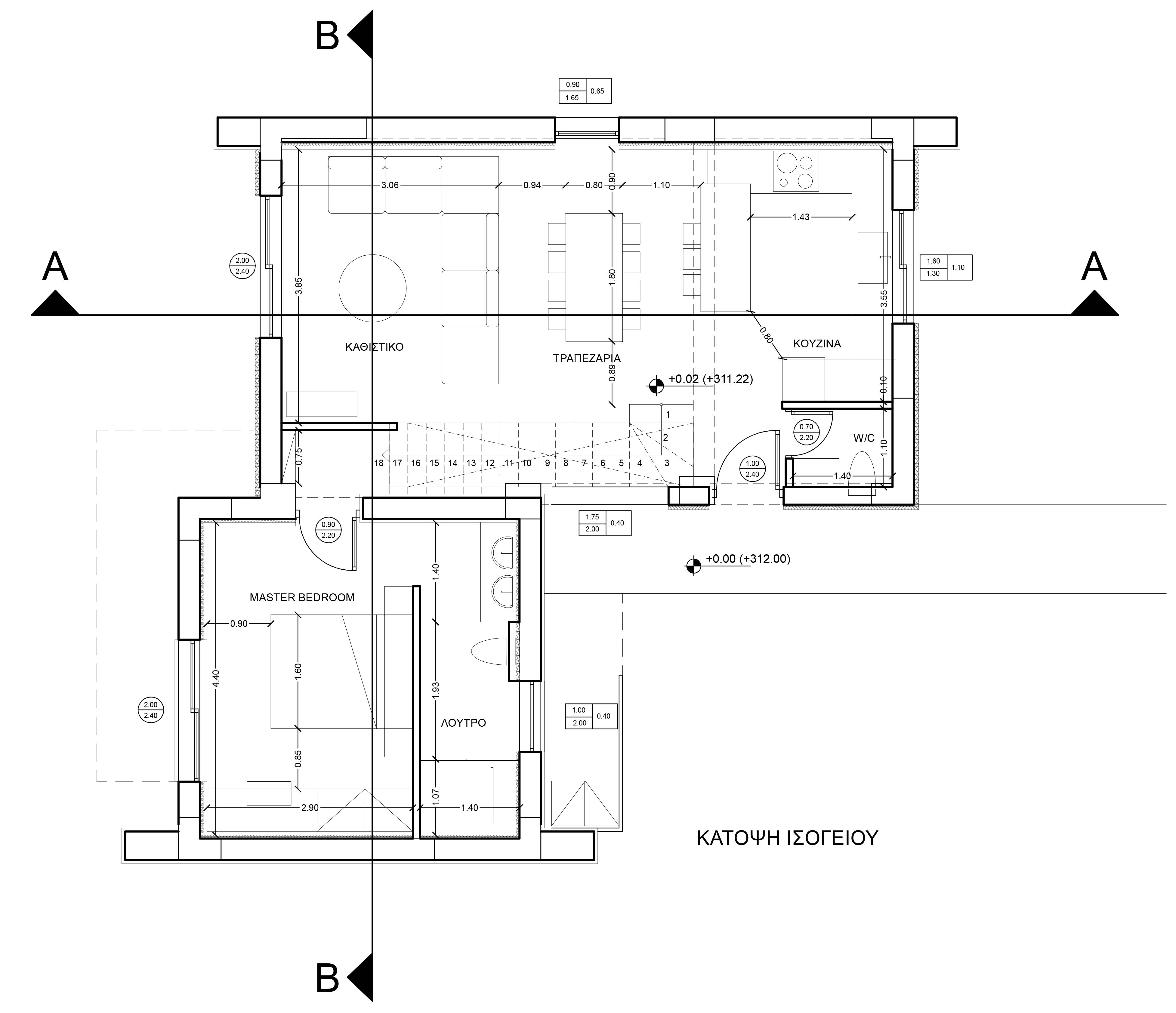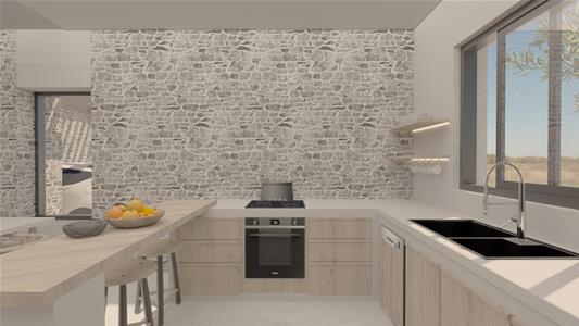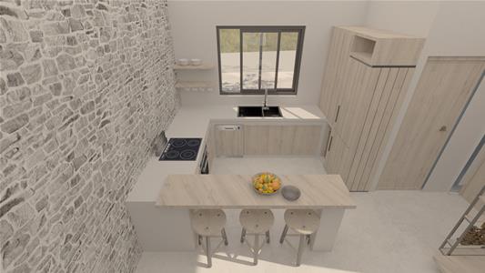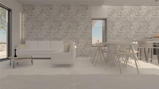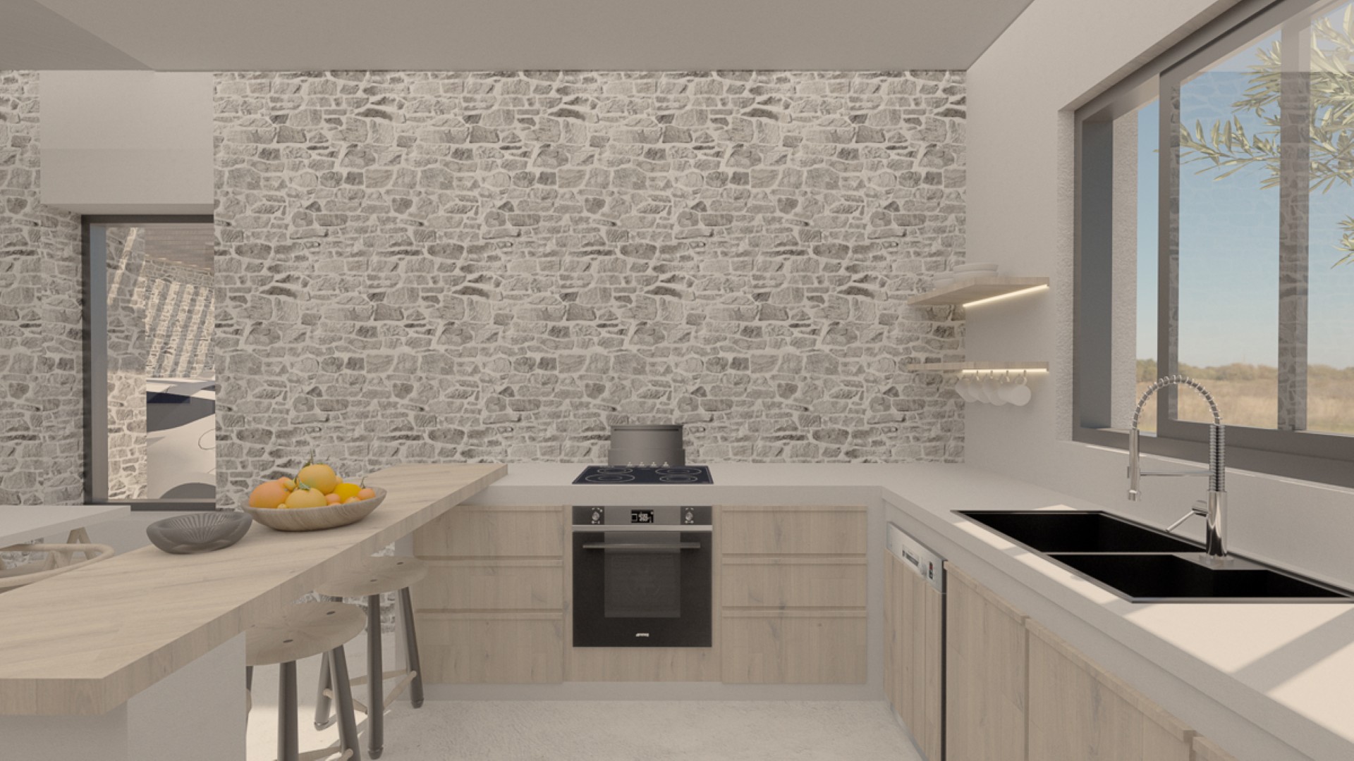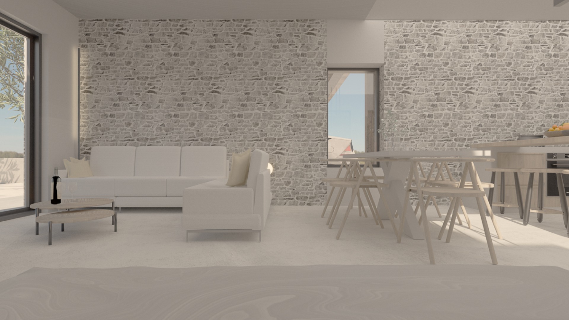 The main entrance opens into the spacious open plan kitchen/dining room. On the right of the entrance is also a WC. The kitchen includes a large number of storage cupboards as well as an island. A dining area is lighted by hidden spots in the plasterboard above it. The living room has a wide patio door and overlooks the pool and gardens.
