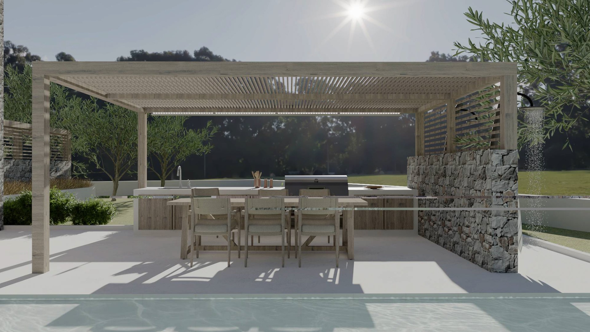 The villa "divides" the land into front and back. At the back of the house is the parking, entrance and some garden, while in the front is the private 40m2 swimming pool surrounded by sun terraces, a wonderful covered BBQ and external dining space, and landscaped gardens passed the pool.