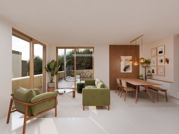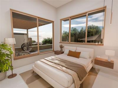 The property comprises of an open plan kitchen, dinning area and living area seamlessly connected through a large patio door to an outdoor pergola-seating area and the swimming pool. Two spacious bedrooms, one with en-suite bathroom, with direct access to the terrace and swimming pool.