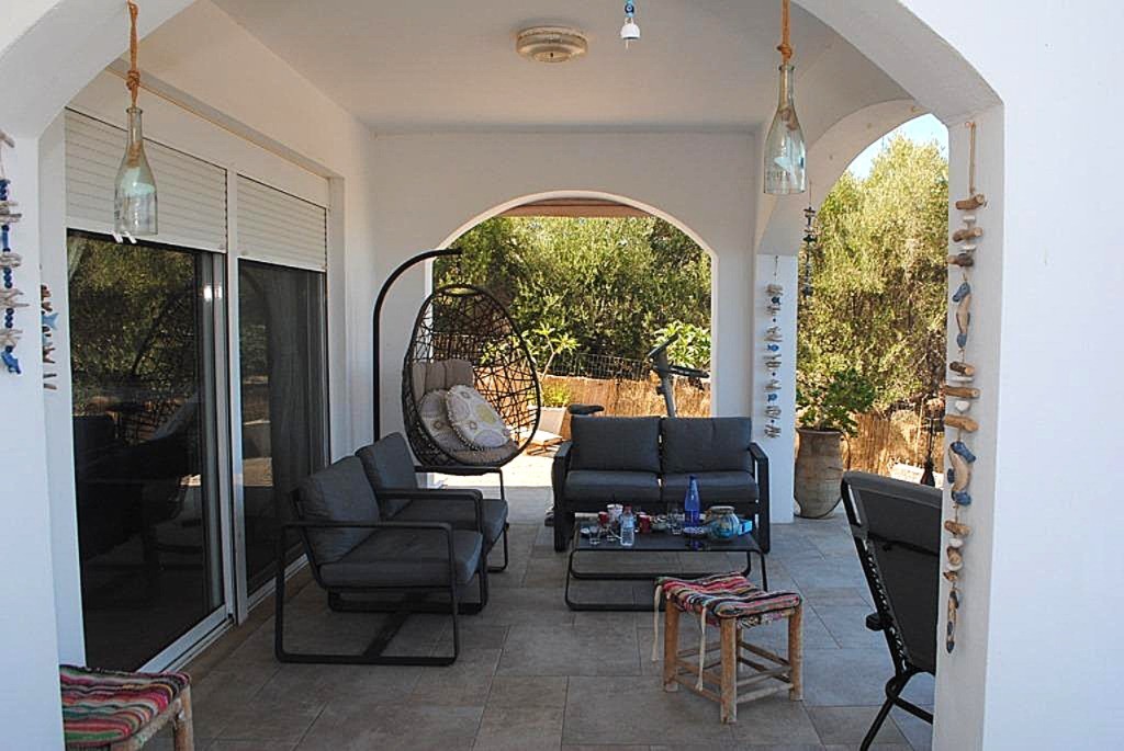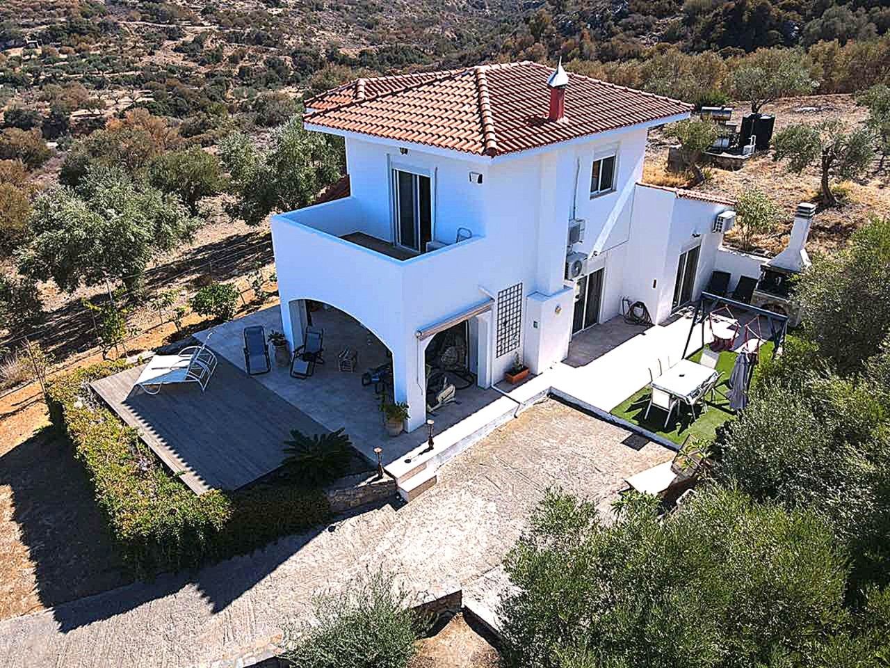 Front raised and covered terrace. Olive trees and uncultivated garden area to the rear of the property.