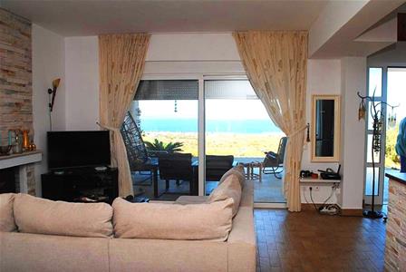 Open plan living room/dining area with sea views. Fireplace. Double doors to covered front terrace.