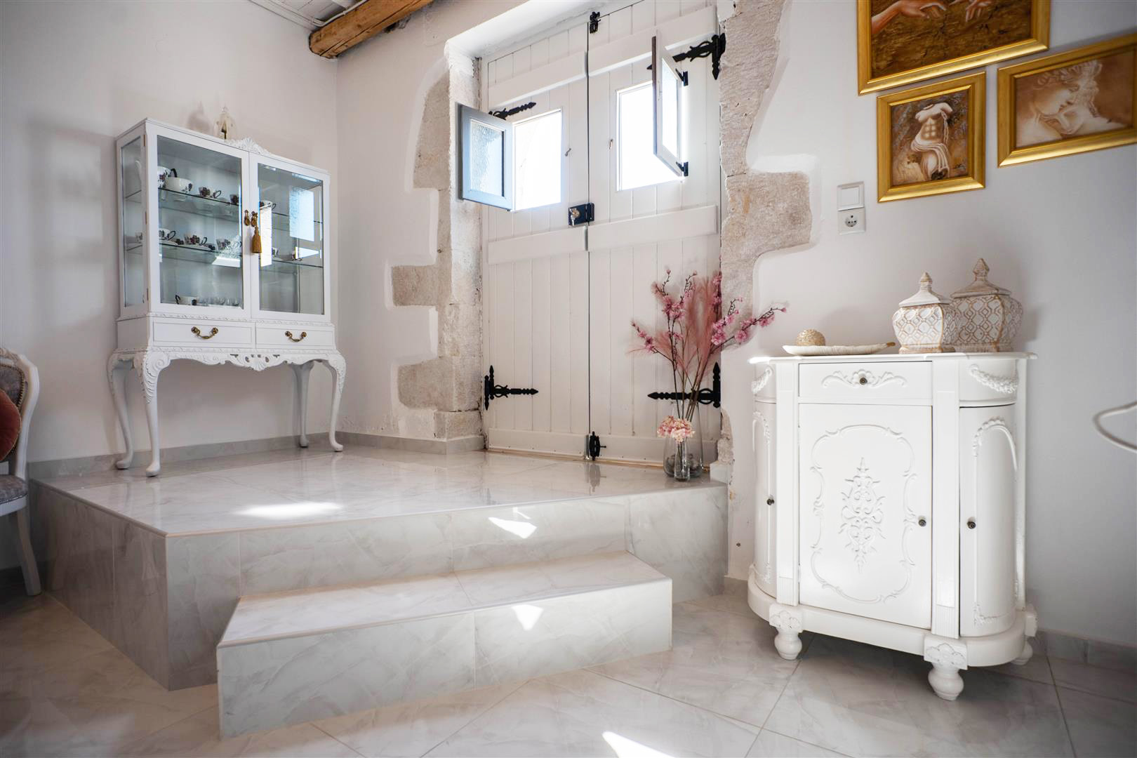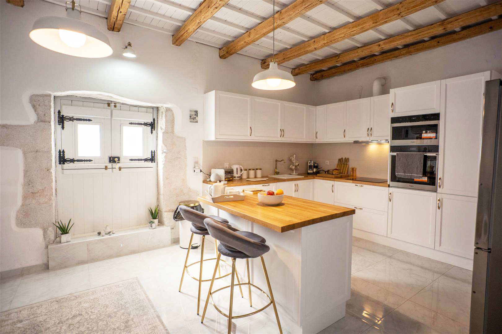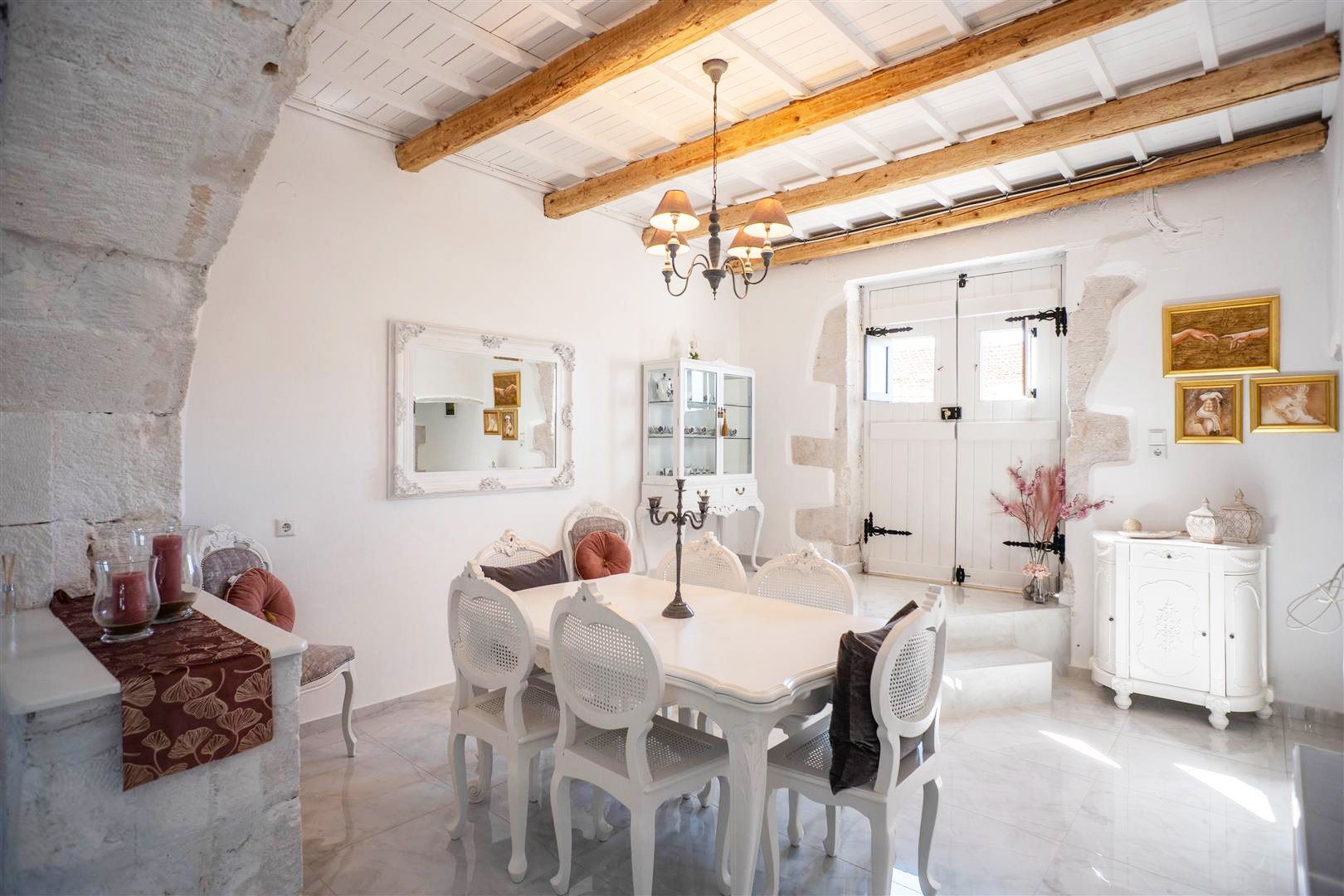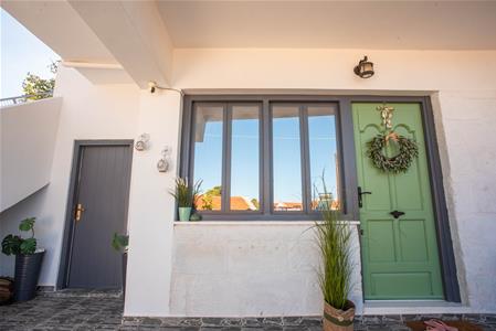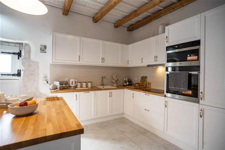 Another beautiful stone arch gives access to the dining room which has double doors leading onto the west side of the villa and directly onto the village road. There is also a smaller opening leading directly into the kitchen for easy access, to serve all your family and friends the traditional Greek cuisine!