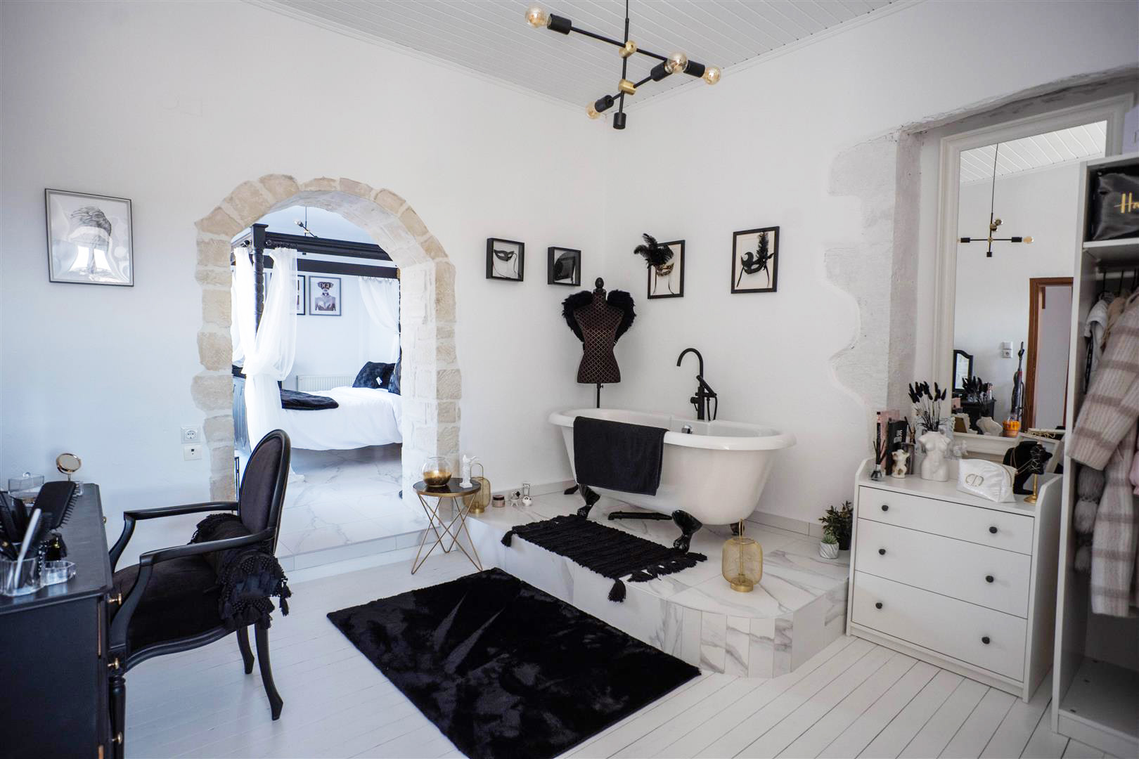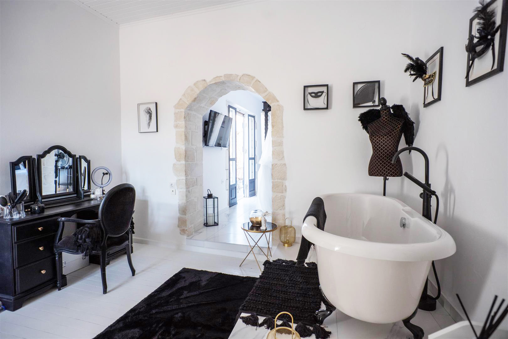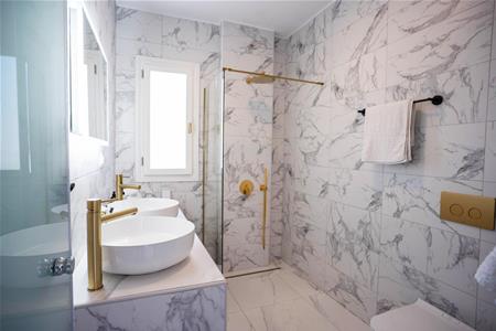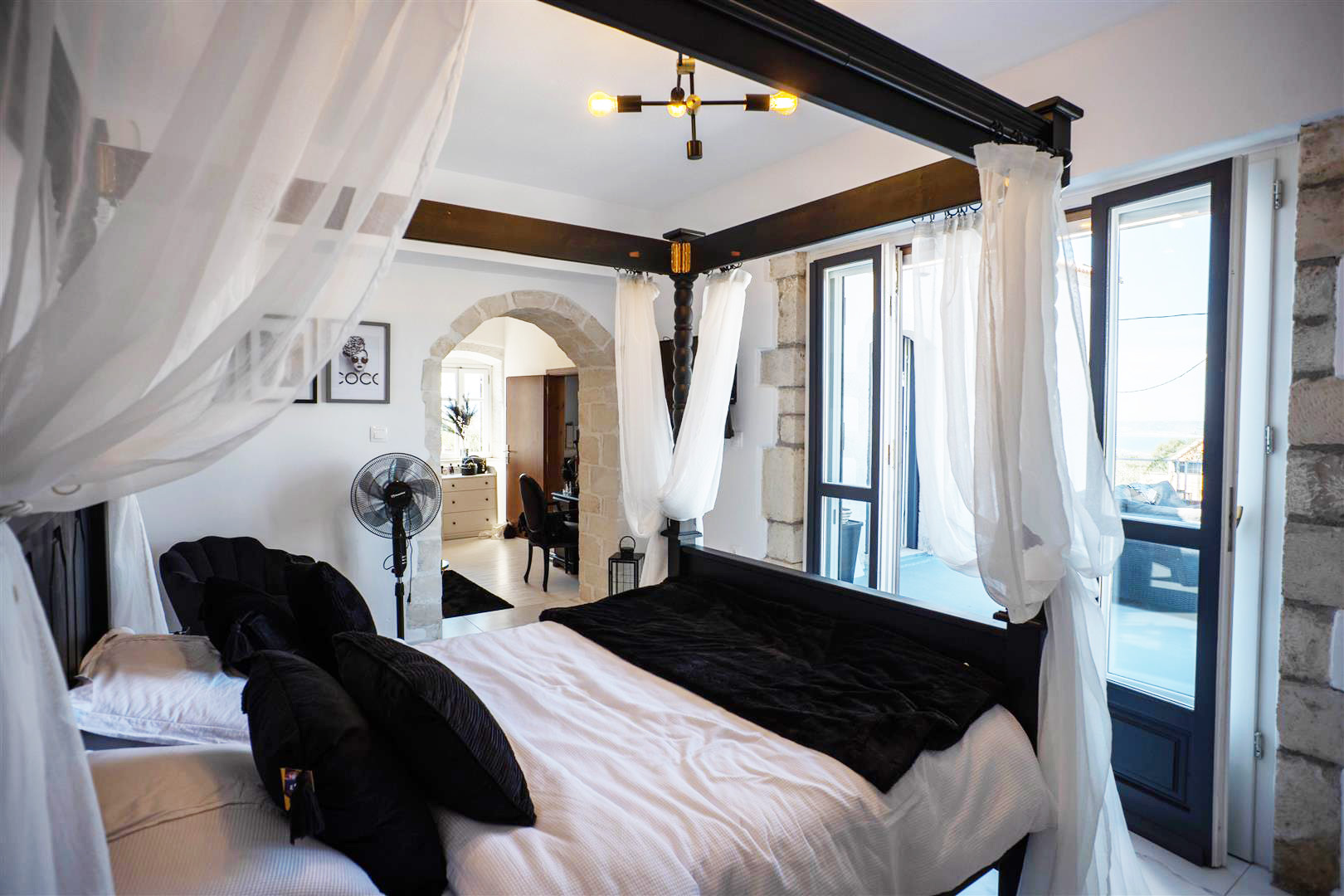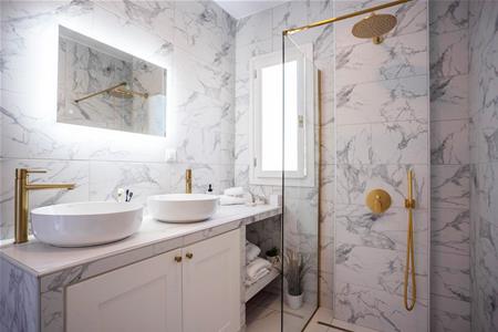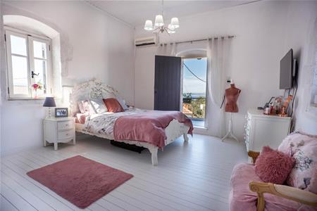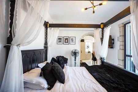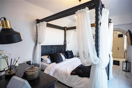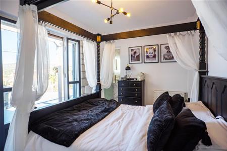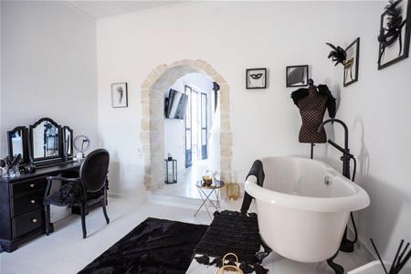 The recently built master suite has a private large dressing room with a beautiful free standing roll top bath and wardrobe storage space. Through a stone arch you enter the bedroom waking up to beautiful sea view every day. This bedroom also has an en suite bathroom with lovely features such as rainfall shower, under sink storage and his and hers sinks!