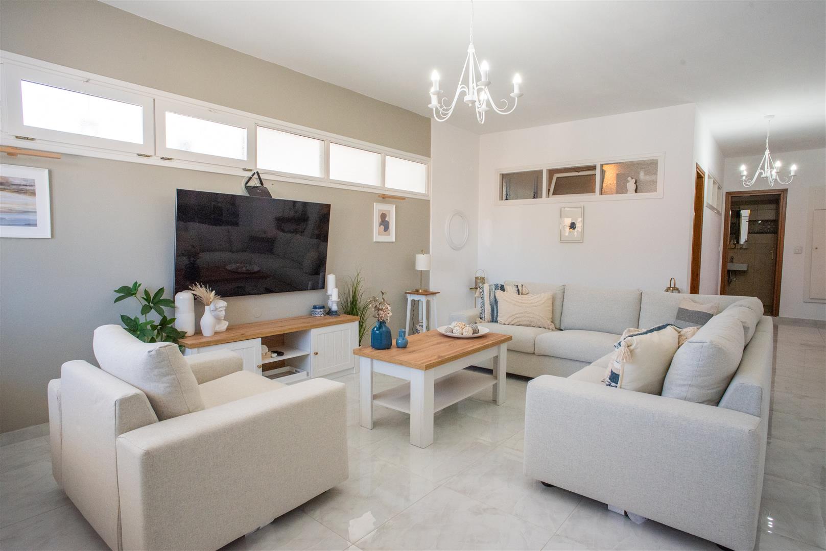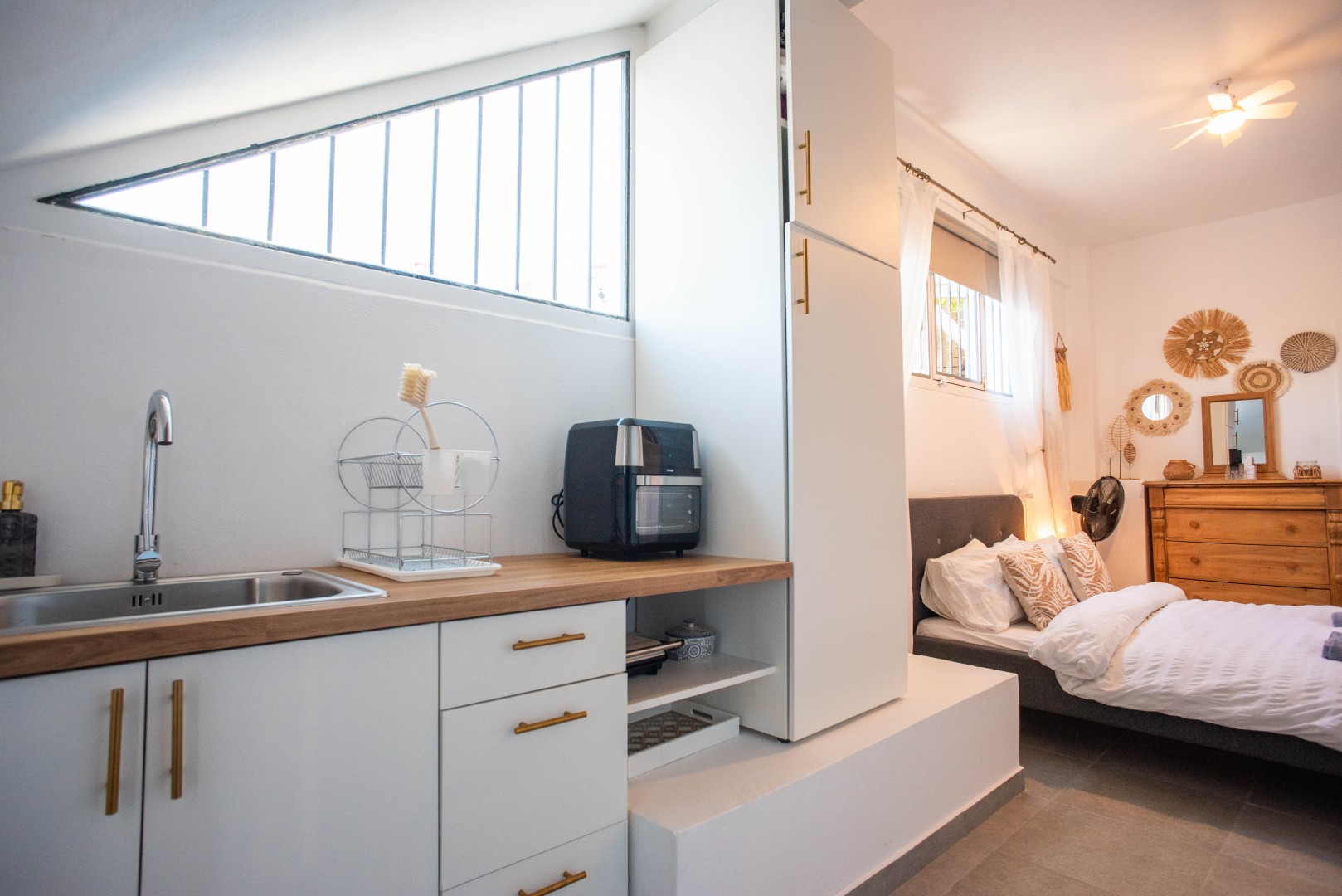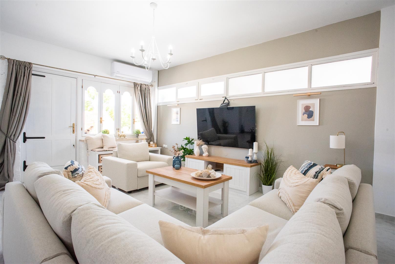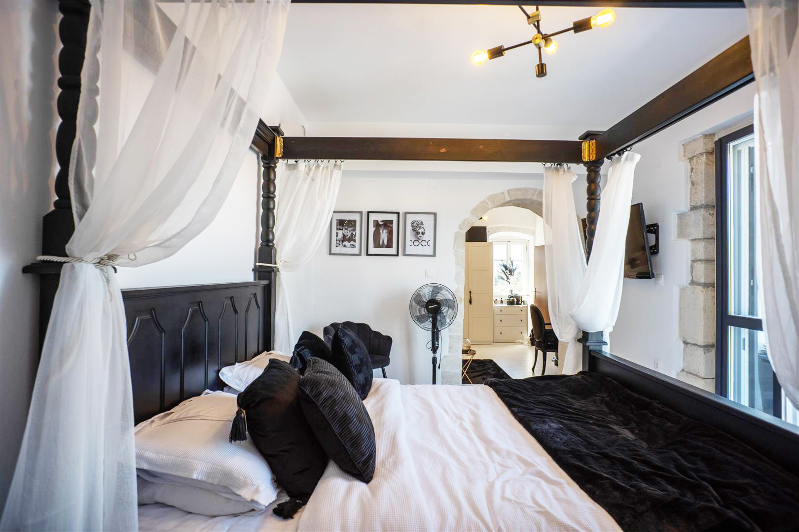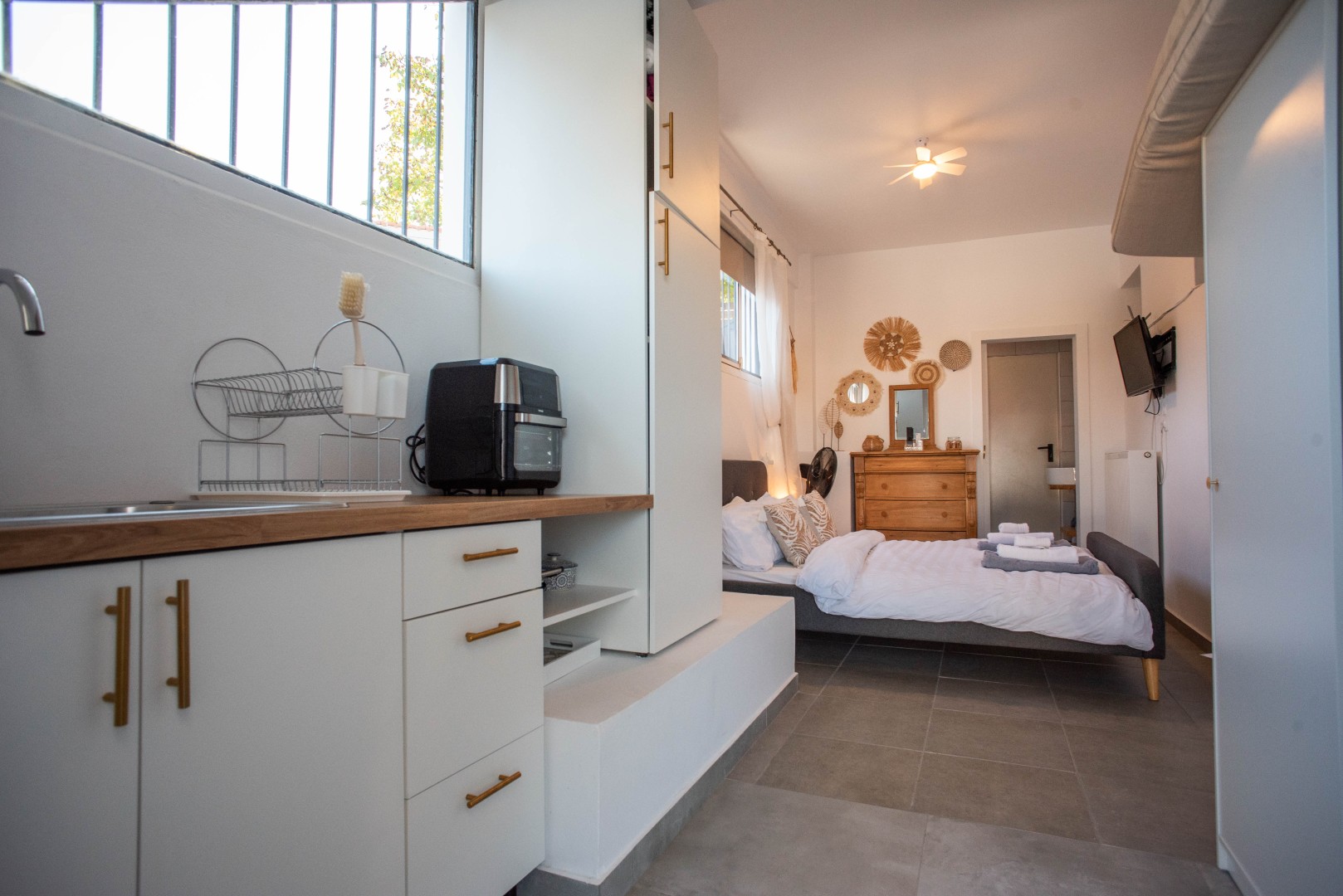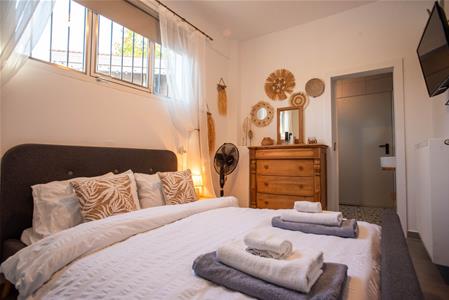 Next to the living room is the ground floor bedroom, equipped with a ceiling fan and TV, and will include all furniture.