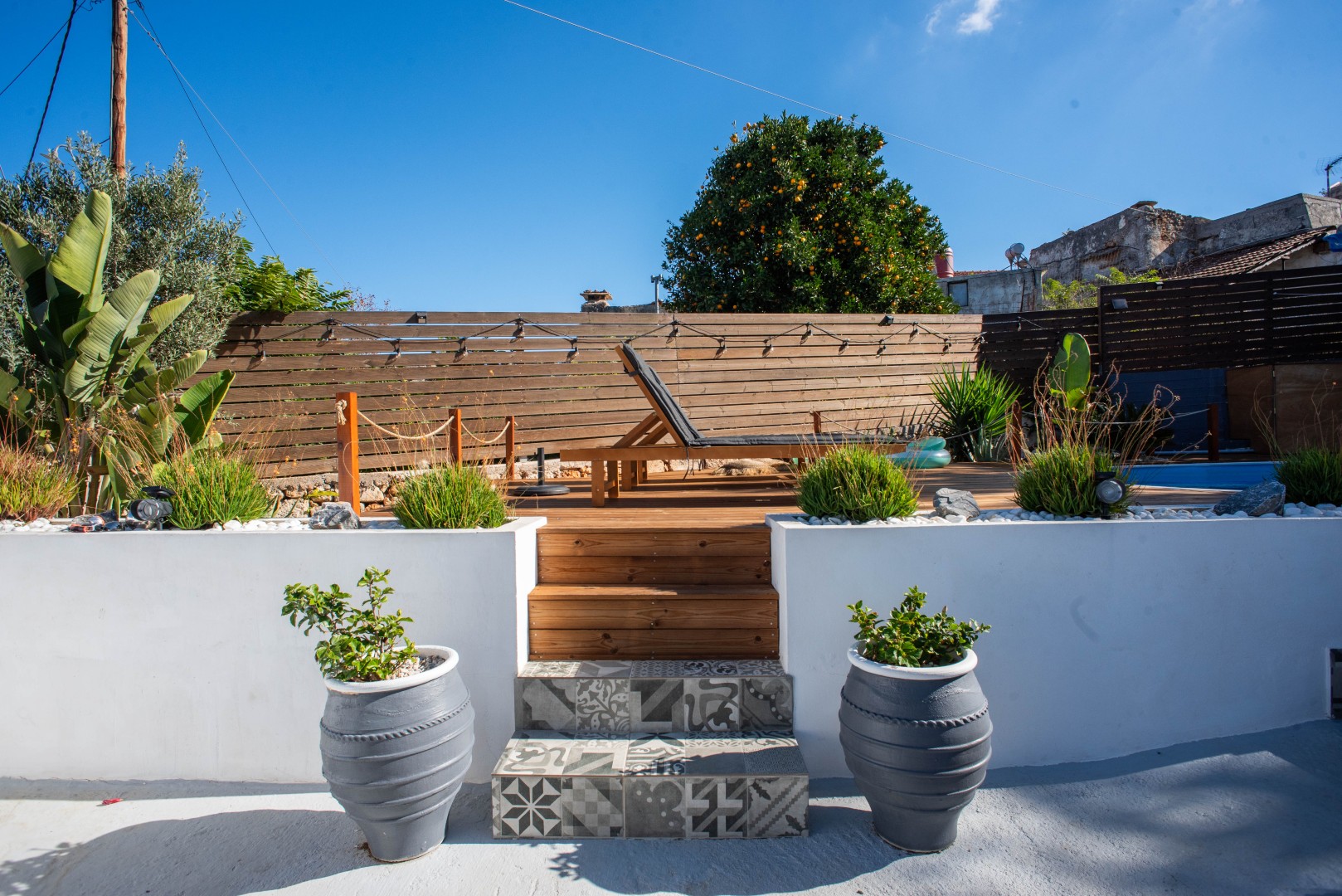 The enclosed landscaped garden is mostly graveled and has a watering system in place. Many seating, dining and sun lounge areas are found along the house's side and in front of the main entrance. A wooden fence provides the wanted privacy.