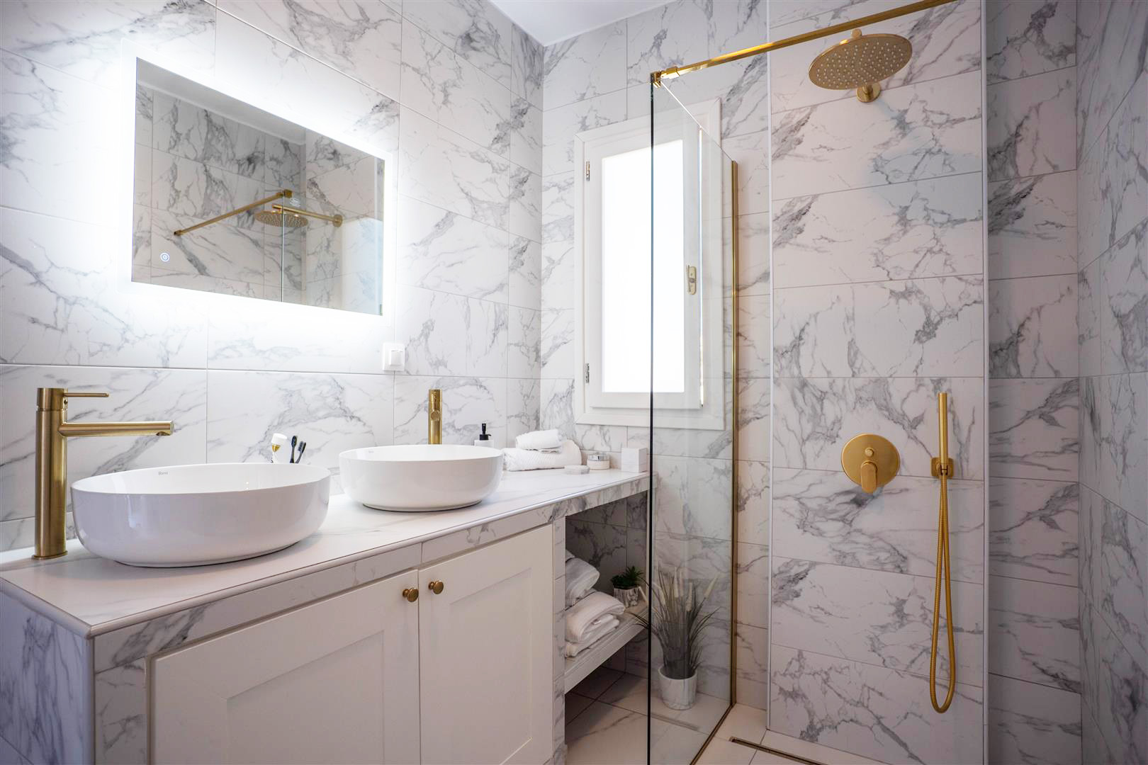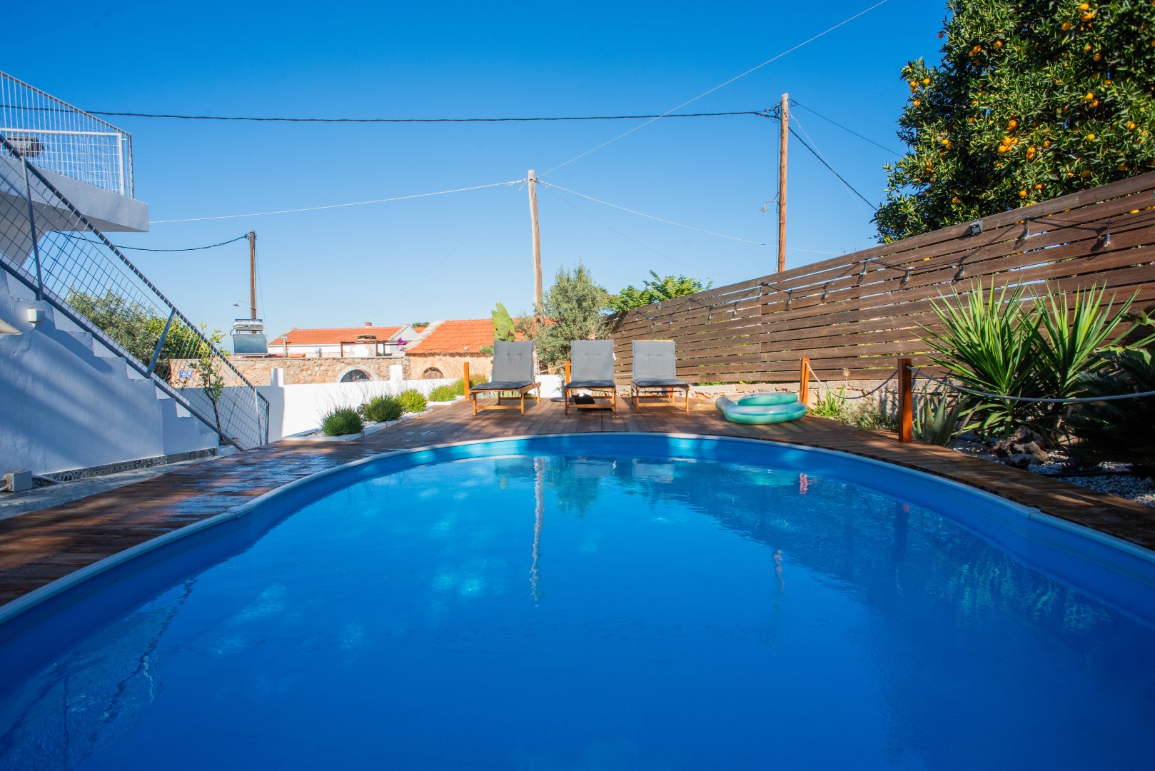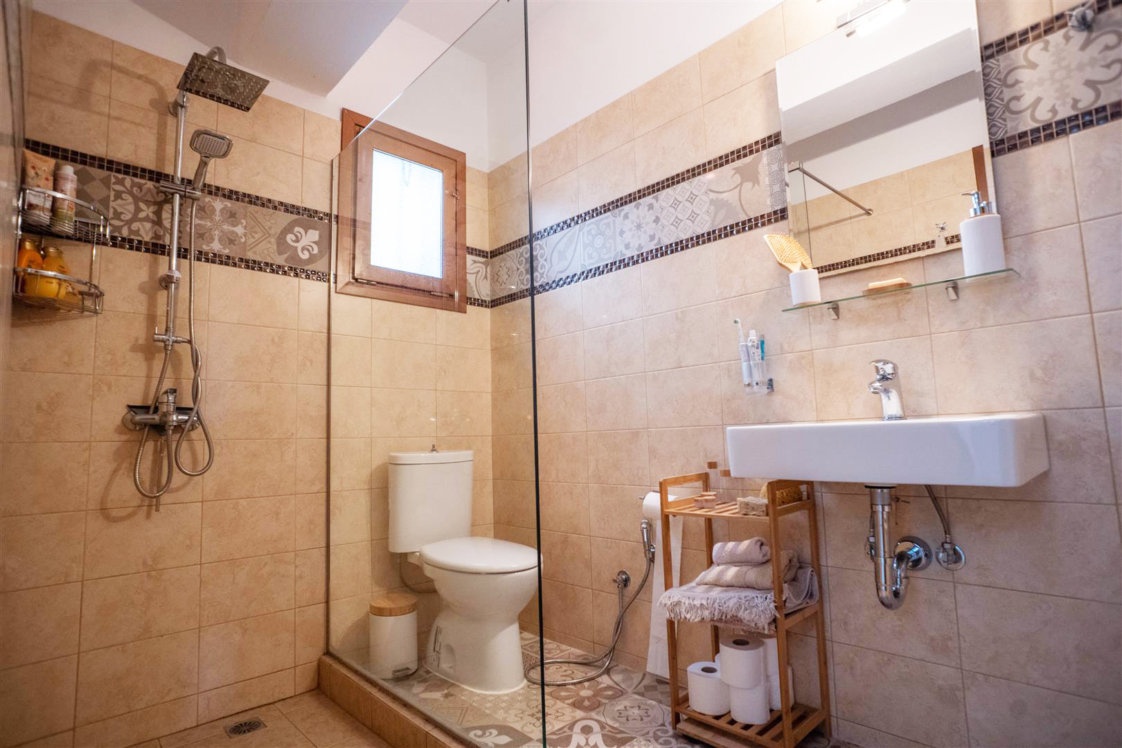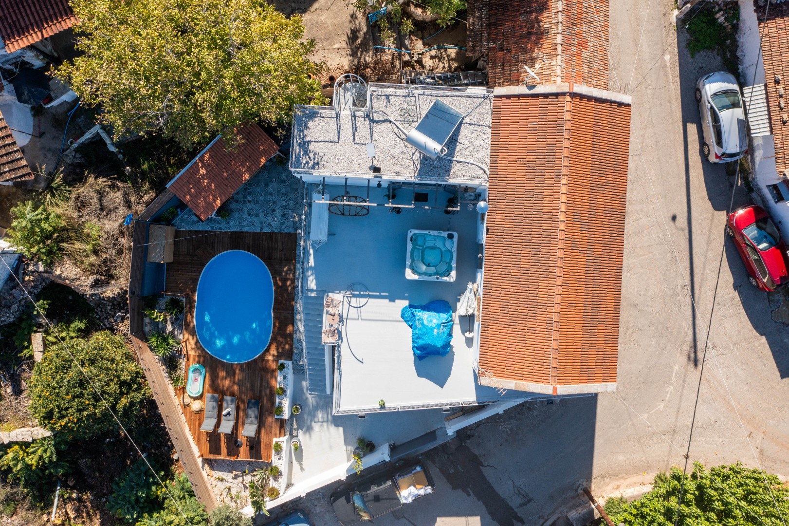 There is an external staircase leading from the ground floor garden/lounge area onto the very spacious first floor terrace where a Jacuzzi and a lounge are placed! The perfect spot to cool down on a hot summers day, while enjoying the surrounding village and sea views!