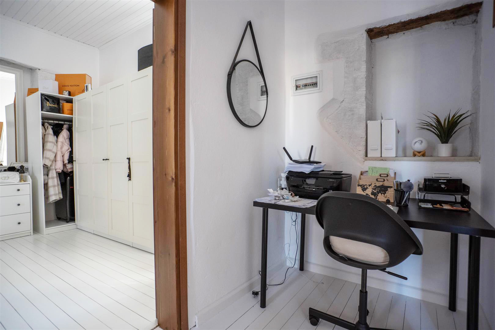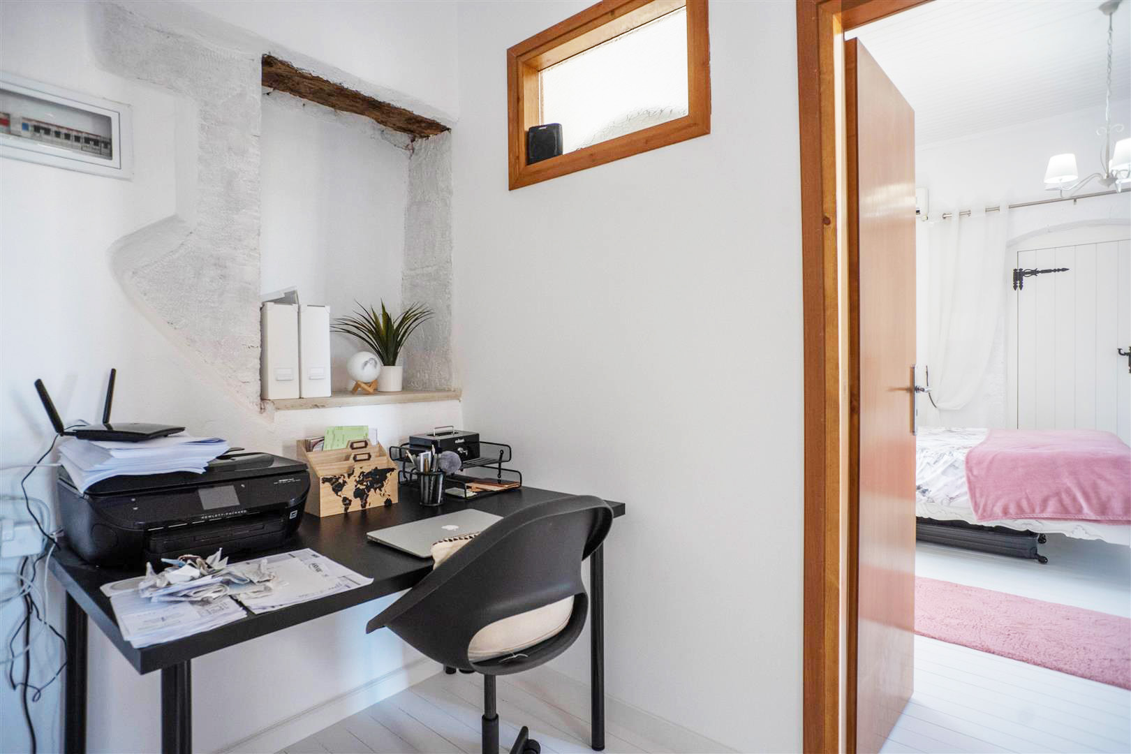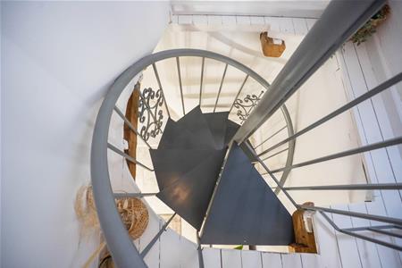 From the kitchen area a spiral metal staircase leads to a landing area which is currently used as an office space. From here there is access to two very spacious double bedrooms.