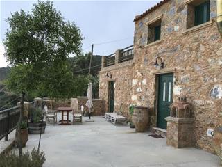 Set in a peaceful location within Saktouria village, this beautifully designed U-shaped home combines traditional Cretan-Cycladic architecture with modern comfort and sustainability. Built from stone and concrete and arranged around a sunny, wind-sheltered terrace, the property offers an inviting outdoor living space surrounded by greenery.INTERIORThe house is fully insulated (walls and roof) and equipped with air-conditioning units for heating and cooling in every room, along with electric panels in some areas. A wood burner creates a warm, cozy atmosphere in the living space. The property operates sustainably with 12 solar panels installed in 2023 with batteries and connected to the grid.The lower level, part of the original stone house, has been beautifully restored i ...